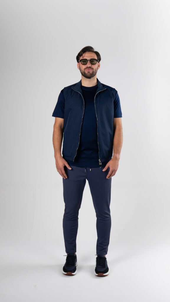 The combination of a lightweight bodywarmer, premium T-shirt, and tapered trousers creates an outfit that is perfect for warm days and cooler evenings. Clean, minimal, and designed for men who value both comfort and style.